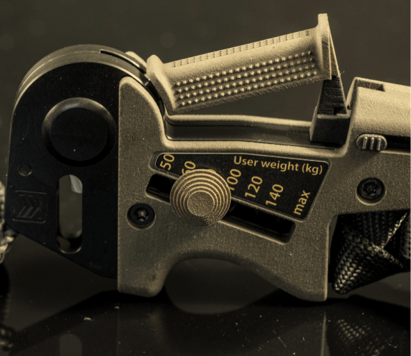 Descent is managed with a single-hand squeeze: press to descend, increase pressure to gain speed, and ease off to slow down — releasing the handle brings you to a full stop.